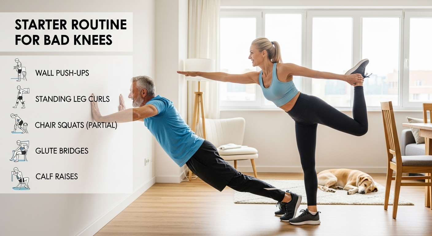 의자에 앉아 다리 펴기, 발목 돌리기, 종아리 올리기 등이 효과적입니다. 무릎 관절에 직접적인 압력을 가하지 않으면서도 하체 근력을 강화할 수 있어요.