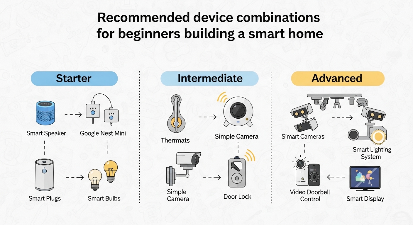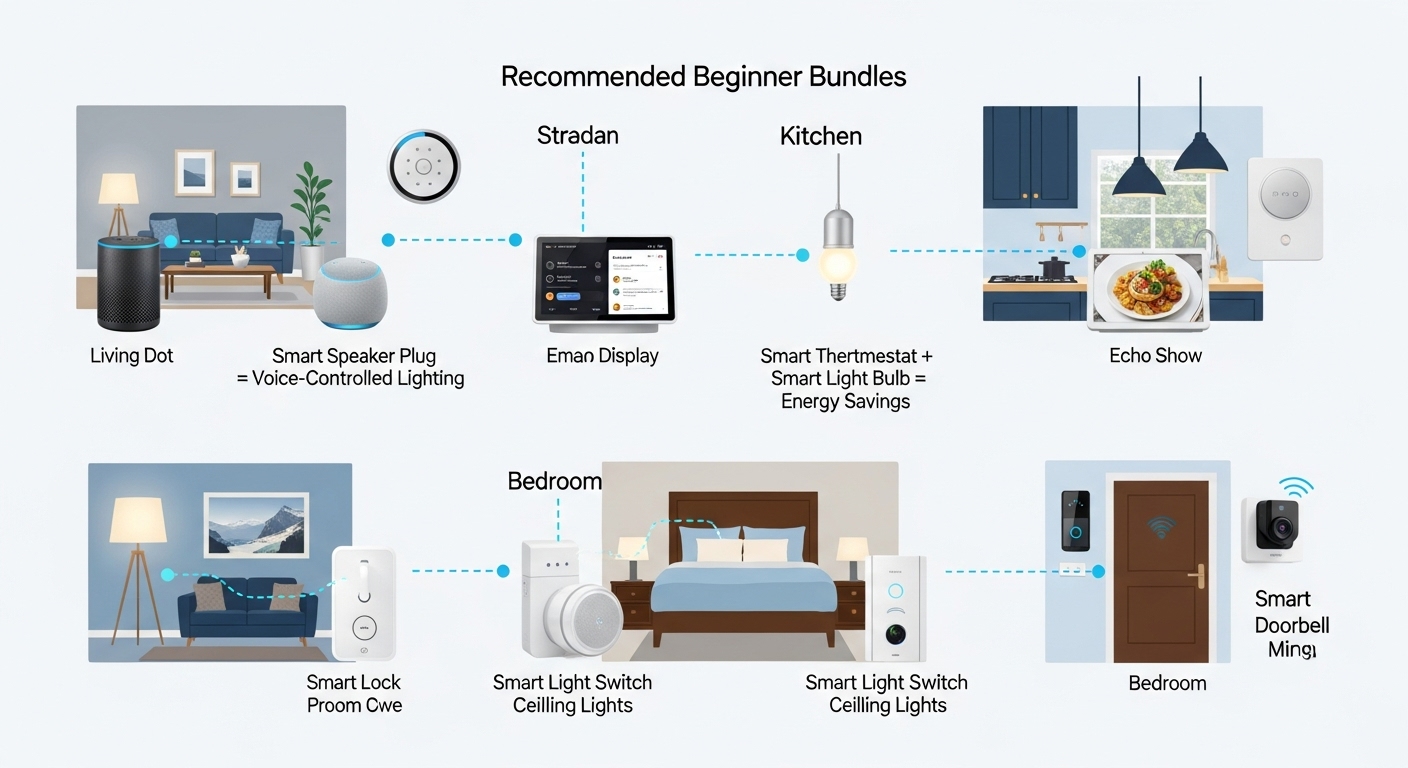 아마존 에코 도트(5만원), 스마트 플러그 3개(6만원), LED 스마트 전구 5개(9만원)로 구성합니다. 이 조합만으로도 음성 제어와 원격 조명 관리가 가능하며, 월 전기료 20% 절약 효과를 볼 수 있습니다.